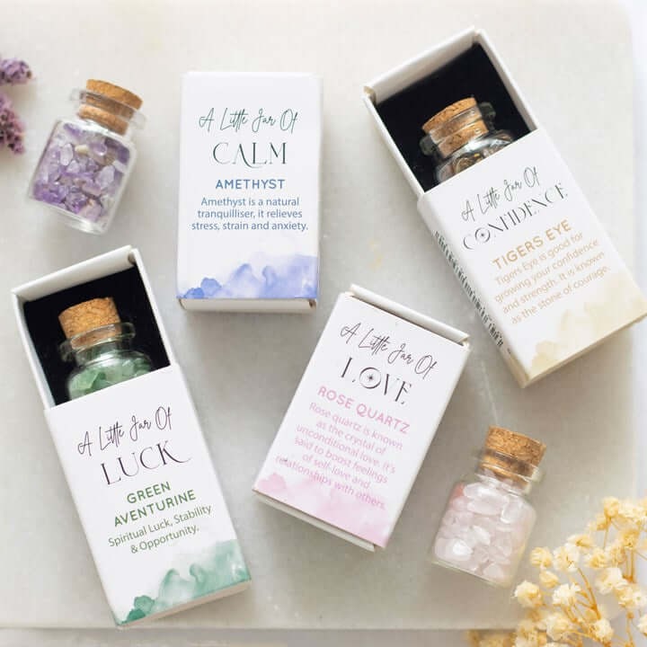 This pocket-sized Jar of Calm holds amethyst crystal chips, known for their relaxing and stress-relieving spiritual properties. Nestled in a matching matchbox, this lucky jar makes a charming gift that brings a touch of earthy energy and peace to its owner's busy mind.